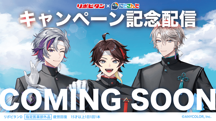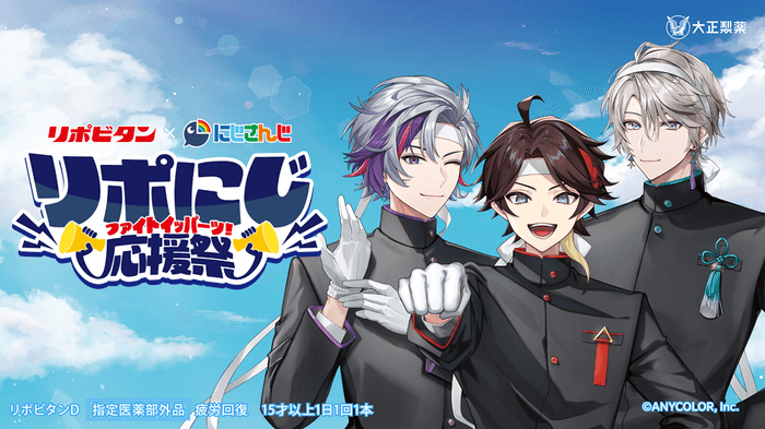 大正製薬株式会社[本社:東京都豊島区 社長:上原 茂](以下、当社)は、ANYCOLOR株式会社[本社:東京都港区 代表取締役:田角 陸]が運営するVTuberグループ「にじさんじ」に所属する三枝明那(さえぐさあきな)さん、不破湊(ふわみなと)さん、甲斐田晴(かいだはる)さんとリポビタンのコラボキャンペーン、「リポにじ応援祭」を開催します。