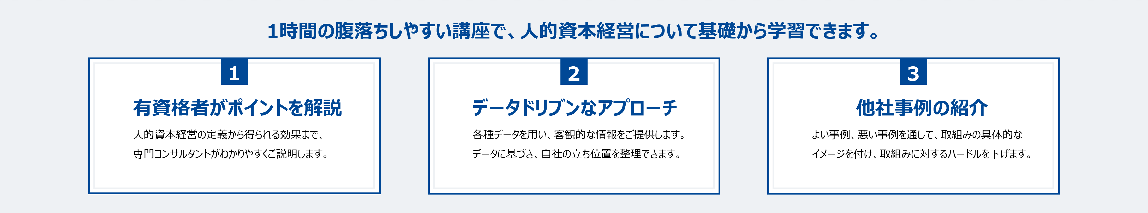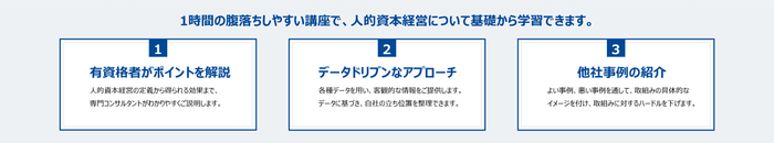 本講座は、人事部に加え経営層や経営管理部、事業責任者、IR担当者など、企業経営の根幹となる「組織」を支える方々に、人的資本経営の正しい知識と理解を深めていただくことができます。有資格者によるデータを用いたご説明で、自社の立ち位置を把握し、他社事例を見ながらどんなことに取り組むべきか、議論ができるようになります。講座は1時間で、WEBもしくは対面にて開催可能です。業種、規模、上場/非上場を問わず、ご満足いただける内容となっています。お客様のご要望、お悩みに応じて、内容や講義時間をカスタマイズできるプランもご用意していますので、プラン詳細は弊社HPをご覧ください。