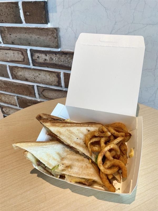 地元の定番「ポークたまご」を片手で楽しめるホットサンドに。海ドライブやおやつにぴったり。