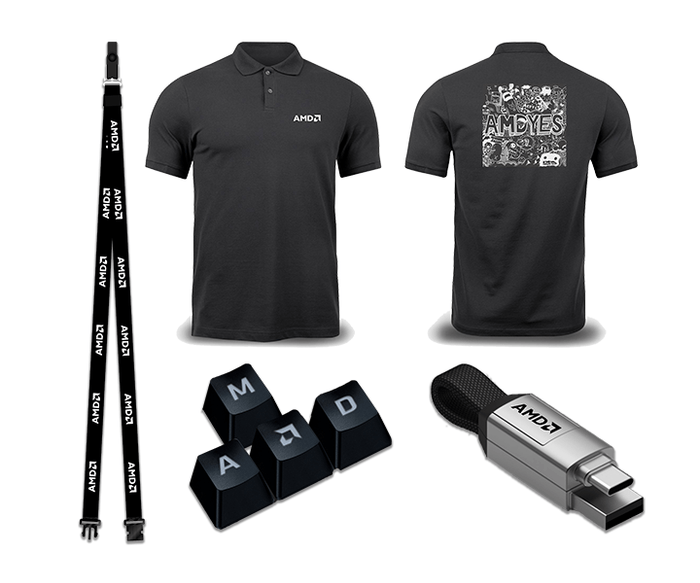 AMD4点セット / AMD ドライフィットポロシャツ、AMD ロゴ入り incharge 6、AMD ロゴ入りキーキャップ、AMD ネックストラップ