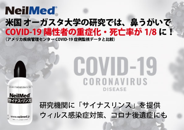 ニールメッド株式会社が米国オーガスタ大学の研究に鼻うがい「サイナスリンス」を提供。COVID-19陽性者を対象に1日2回2週間、鼻うがいを実施させた結果、重症化・死亡率が 1/8 になったという研究結果が発表されました。(CDC=アメリカ疾病管理センター COVID-19 症例監視データと比較)