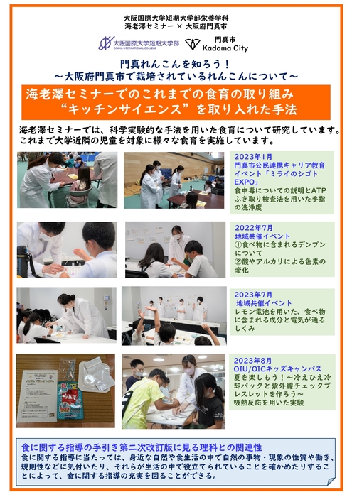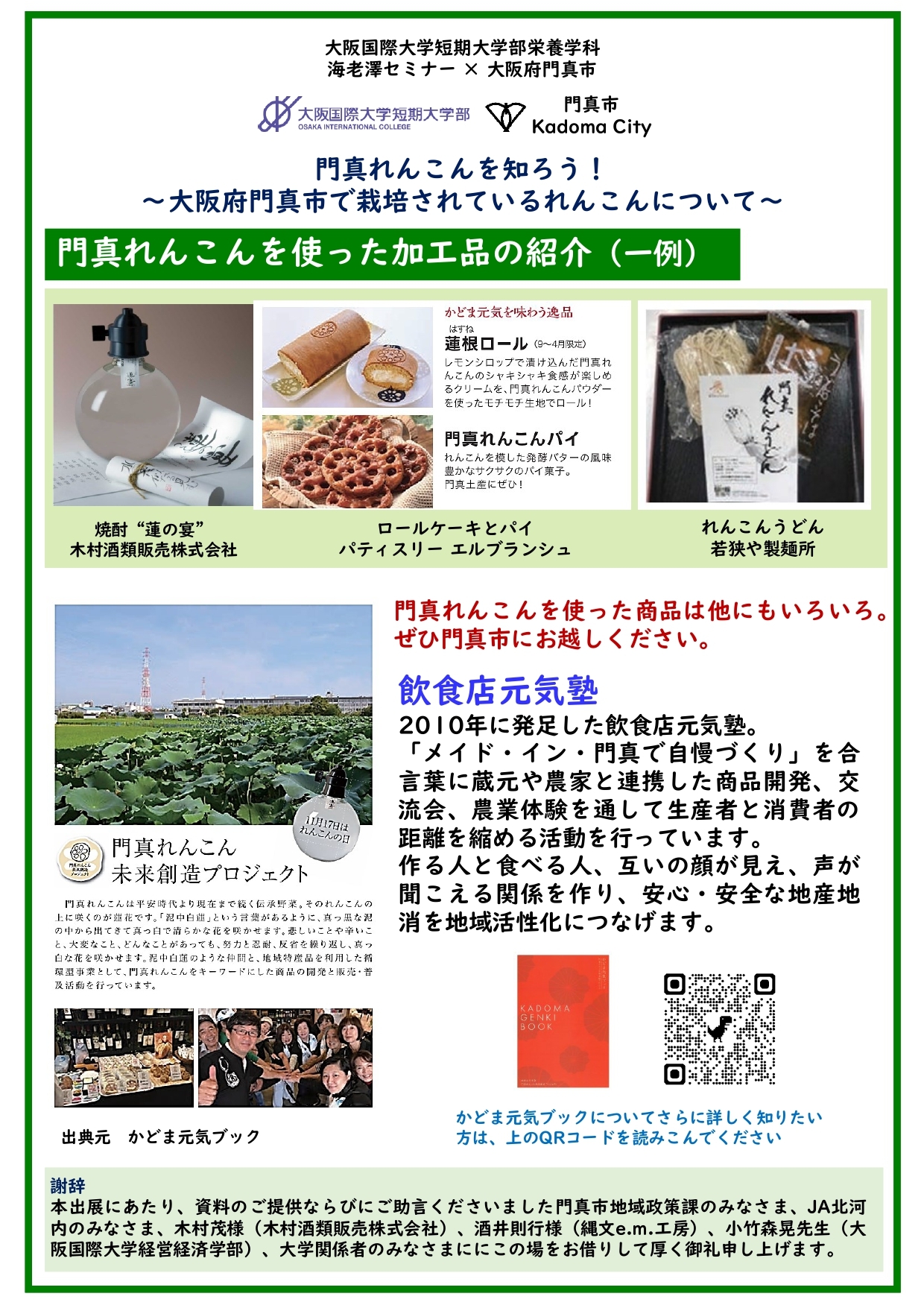 海老澤セミナーでは大学近隣の農産物である門真市の伝統野菜である「門真れんこん」の活用やキッチンサイエンスについて研究しています。また、栄養学科では地域共催イベントの実施をはじめ、近隣自治体での様々な食育イベントに参加しています。食と栄養の専門職である栄養士養成機関として、”食”をとおした地域社会とのつながりについて、発表しました。