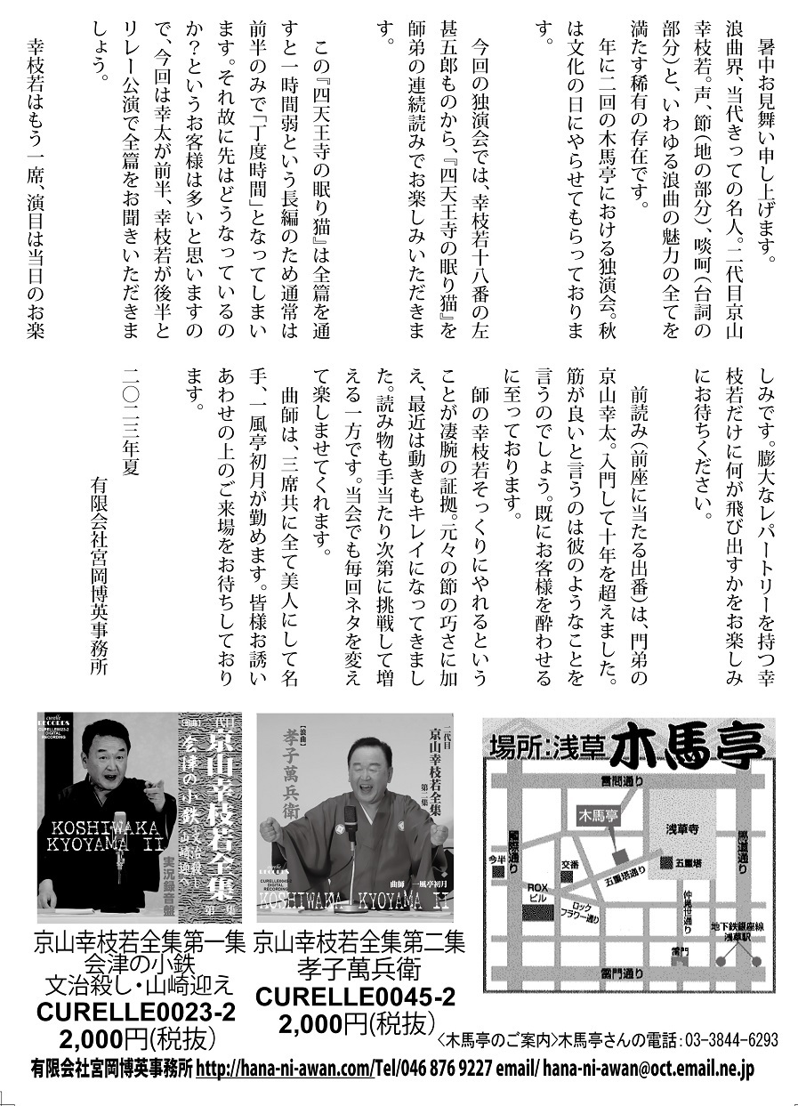 寄席演芸会をプロデュースする有限会社宮岡博英事務所(所在地:神奈川県横須賀市、代表:宮岡博英)は、『第20回京山幸枝若独演会』を11月3日に東京都台東区の浅草木馬亭で開催します。