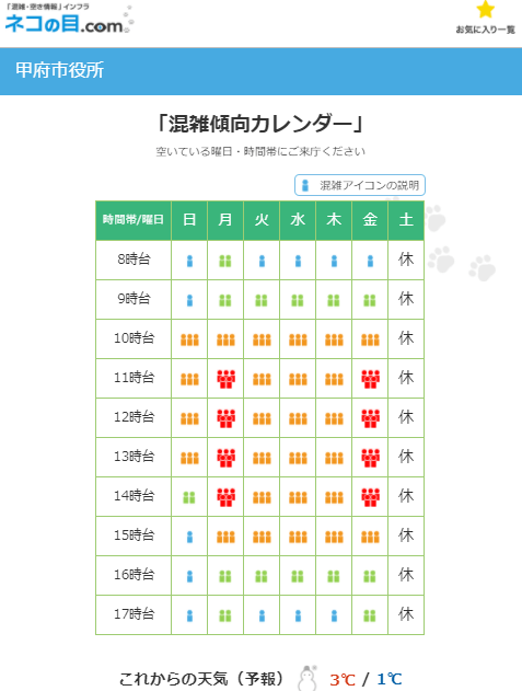 利用者は、甲府市役所ホームページとリプライス株式会社が運営する、混雑・空き情報ポータルサイト「ネコの目.com(R)」(下記リンク先)で確認することで、混雑を回避できるようになります。