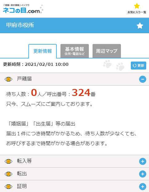 甲府市役所市民課窓口では、窓口での来庁者数増加により、「三密」状況を防ぐための情報サービスとして、リプライス株式会社が提供する、「ネコの目(R)」を採用し、窓口の混雑・空き情報をWebサイト(ネコの目.com(R))上にリアルタイムに配信します。