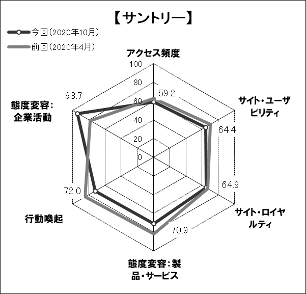 第1位の「サントリー」はWBIが前回のスコアから3.6ポイント減の80.7ポイントで、500サイト中での全体順位は前回と同じく第6位だった(図表3)。「態度変容:企業活動」を除く5つの個別指数の評価が下降し、WBIが落ち込んだものの、「態度変容:企業活動」のスコアが前回から15.7ポイント上昇し、500サイト中第1位の評価を獲得した。