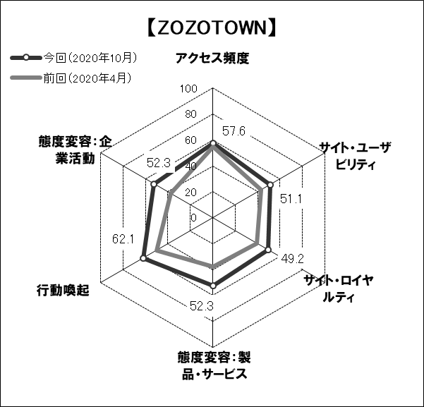 「ZOZOTOWN」は6つの個別指数全ての評価が前回を上回った。項目別にみると、「態度変容:製品・サービス」の「運営主の製品・サービスを購入または導入したい」、「行動喚起」では「メールマガジンの購読、会員専用ページにログイン」「製品・サービスを購入、申込」、「態度変容:企業活動」では「運営主が気に入った、好きになった」の上昇幅が大きい。自由意見では、「身長体重別の検索ができる」「カテゴリーごとに分かれているので探しやすくて良い」など、「ZOZOTOWN」ならではのサービスや、使い勝手をよくするための工夫に対する好意的な評価が見られた。また、新型コロナウイルス感染拡大の影響により、これまで以上にオンラインでの買い物自体への関心が高まったことも考えられる。