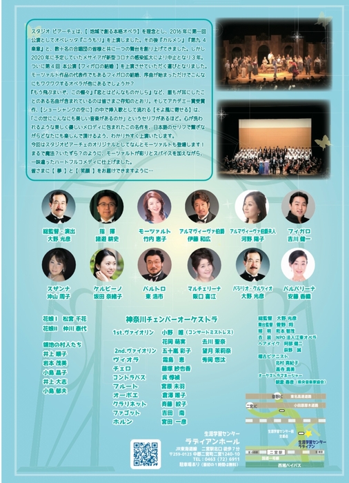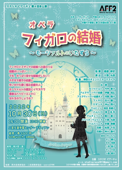 スタジオ ピアーチェ(代表:大野 光彦)主催、スタジオ ピアーチェ第4回 本公演『オペラ フィガロの結婚 ~モーツァルトのいたずら~』が2022年10月30日 (日)に二宮町生涯学習センター ラディアン(神奈川県中郡二宮町二宮1240-10)にて上演されます。