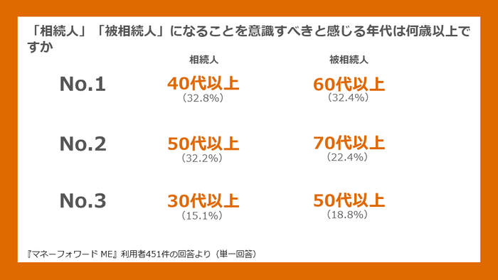 ■「被相続人」になることを意識すべきと感じる年代は「60代以上」。「相続人」を意識する「40代以上」と乖離している状態に