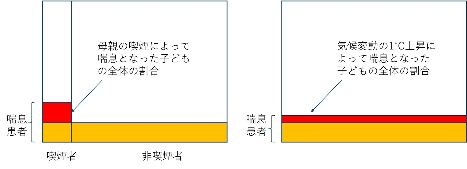 例えば子どもの受動喫煙のリスクについて考えてみたい場合、母親の喫煙者の割合が10%で、非喫煙者の子どもたちも大体10%ぐらいで喘息になるとしましょう。母親がタバコを吸っていて受動喫煙をしてしまった子どもの喘息発症率が2倍になるとした時、その影響を受けるのは、喫煙者の母親を持つ10%の子どもたちだけです。つまり1,400万人の子どもがいたら140万人の子どもに関わる話になります。さらに、全体から見ると受動喫煙によって子どもが実際に喘息になるのは1%でしかないわけです。つまり、1,400万人の子どもがいたら14万人が発症するということです。