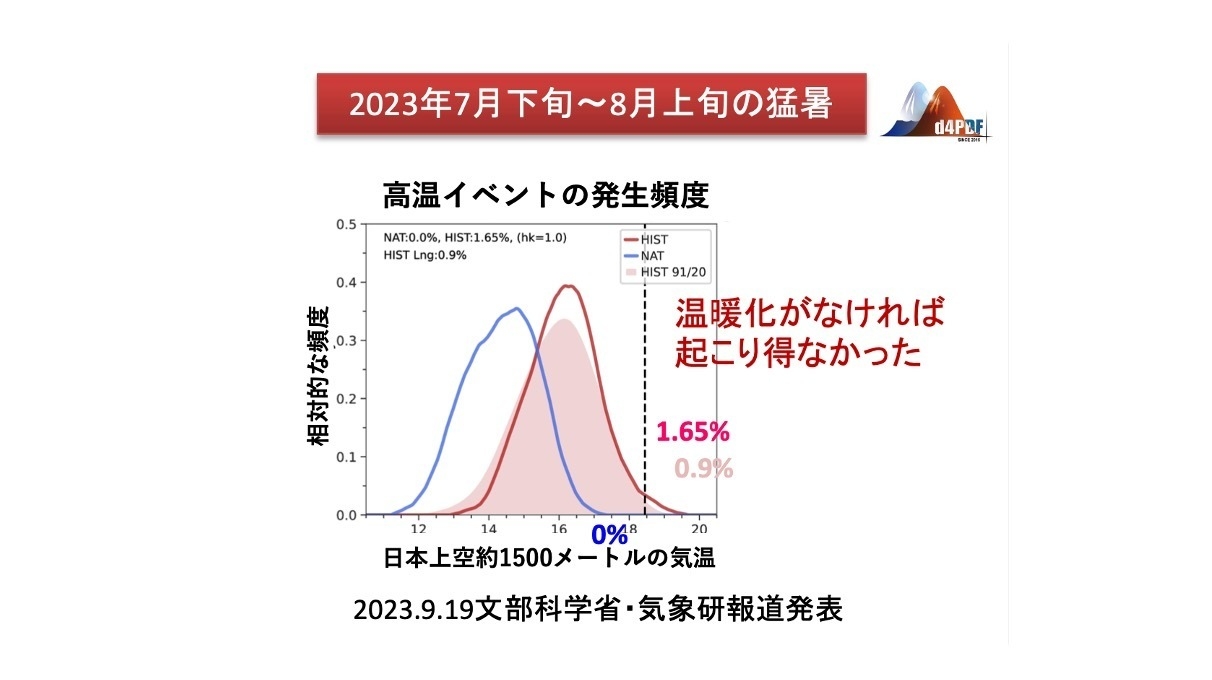 昨年の猛暑にイベント・アトリビューションを適用してみると、温暖化している条件では発生確率が1.65%、温暖化していないと発生確率が0%なので、温暖化がなければ昨年のような異常なことは起こり得なかったということが証明されたわけです。