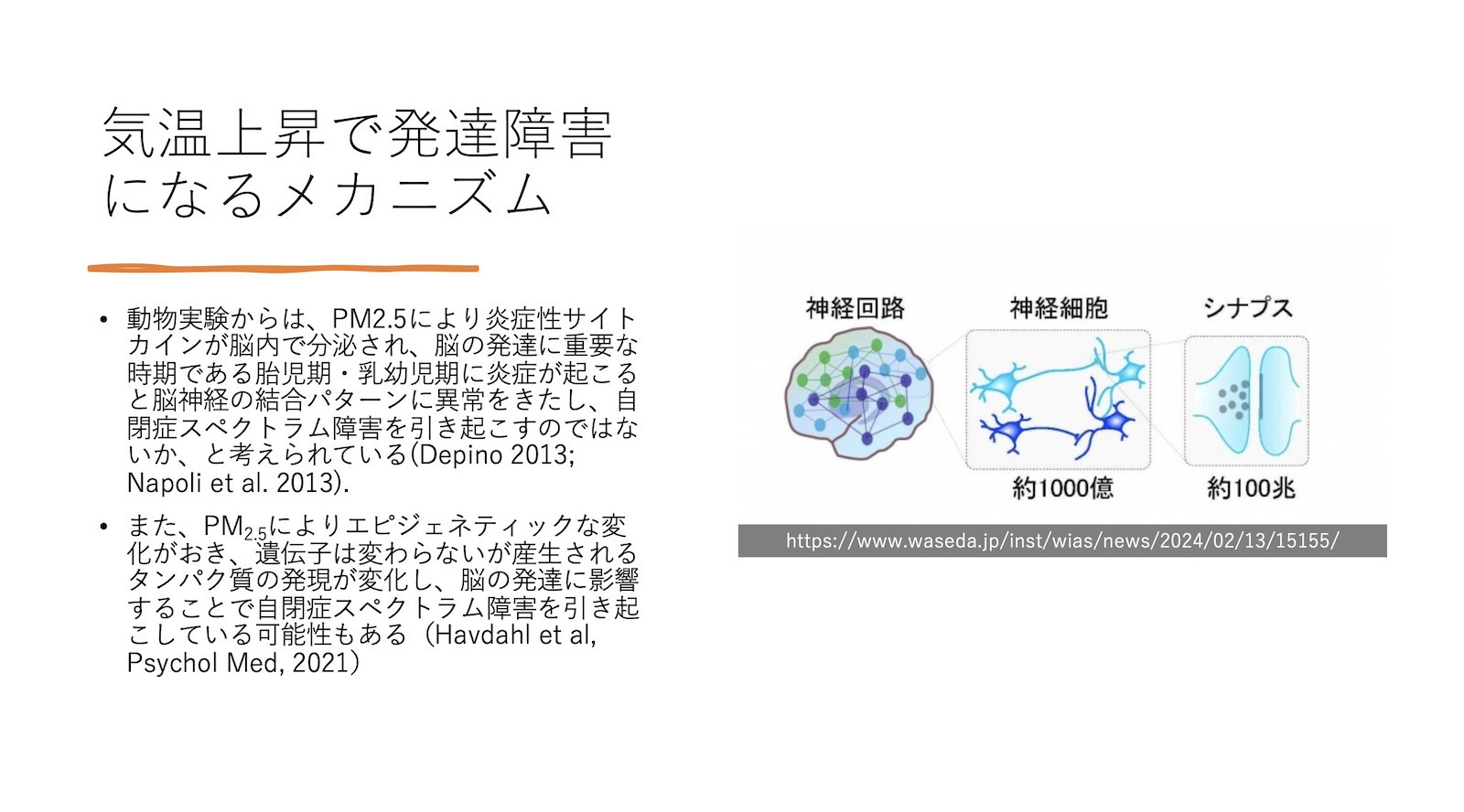 「発達障害」については、気候変動というか、気温、熱によって、直接発達障害のリスクを上げるという事実はまだないのですが、間接的に、気候変動によって増加すると考えられる大気汚染や農薬の使用が、発達障害のリスクという風に考えられています。PM2.5の程度も違うので、直接的に日本に応用できるかは分かりませんが、アメリカのデータによると、2歳までのPM2.5の暴露によって、自閉症スペクトラム障害のリスクが1.5倍近くになるといった例があります。