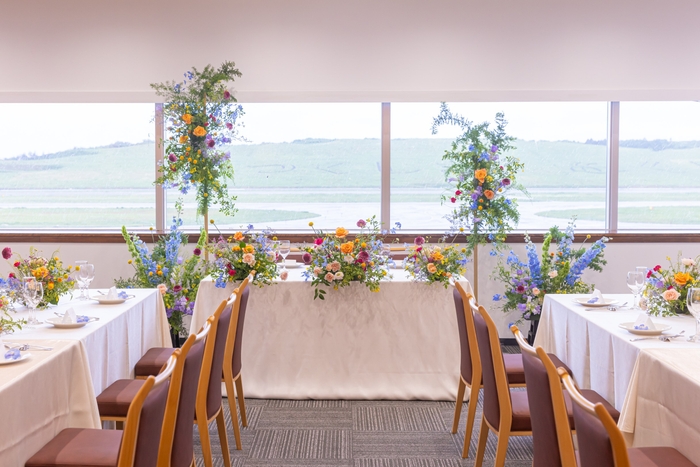 ※装花:メインテーブル装花、ゲストテーブル装花、フォトブース、ビュッフェ台装花、ブーケ・ブートニア1点ずつ