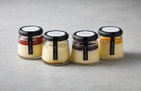 レアチーズプリンはプレーン、ブルーベリー、いちご、マンゴーの4つのフレーバーをご用意しました。