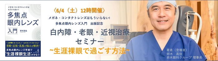 株式会社幻冬舎メディアコンサルティング(本社:東京都渋谷区、代表取締役:久保田貴幸)は、鈴木眼科クループ 理事長の鈴木高佳医師による、「多焦点眼内レンズ」を使った老眼治療についてわかりやすく解説する『白内障・老眼・近視治療セミナー生涯裸眼で過ごす方法』セミナーを、2022年6月4日(土)に開催いたします。