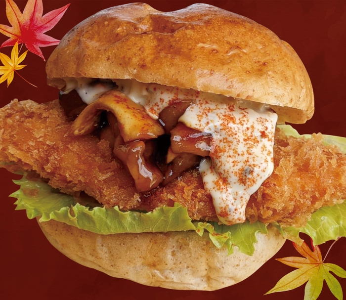 富士山の恵みを受け育った富士山サーモンはしっかりとした身質と甘みの強さが特徴です。富士山サーモンのサクサクフライと共に、照焼きソースで絡めた伊豆のしいたけと、特製のしいたけ入りタルタルソースの相性は抜群です。秋に食べたいおすすめバーガーです。
