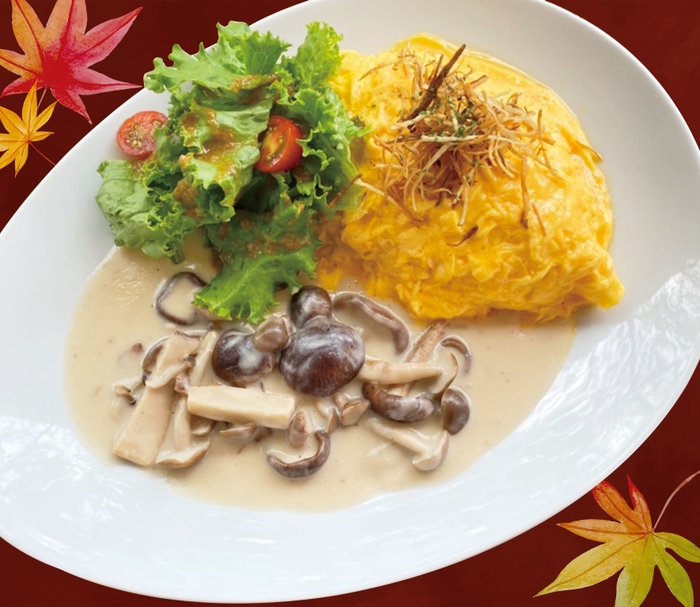 TAMAGOYAで人気のオムライスに期間限定できのこクリームソースが仲間入りです。ふわふわ食感のオムライスに農産物直売所に並んだきのこをたっぷり使用したホワイトクリームソースと併せてお召し上がりいただきます。サラダ付きで女性におすすめのメニューです。