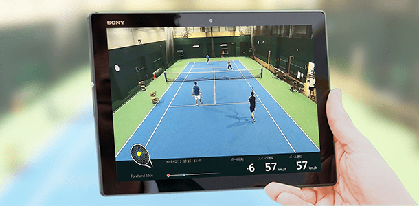 ソニーが開発したラケット装着型センサーSmart Tennis Sensor(スマートテニスセンサー)を使用し、ショットのデータを計測します。また、テニスコートにカメラを設置し、プレイヤーの動きを映像でも記録します。ショットのデータおよびプレイ映像は、コートサイドに設置した閲覧用のタブレットや、お手持ちのスマートフォンで確認することができます。