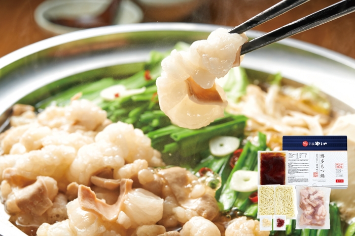 本醸造醤油と長崎県産の焼きあごをベースとしたあごだし醤油スープと、ぷるんととろける国産牛もつが自慢。〆の麺までついた本格もつ鍋セットです。
