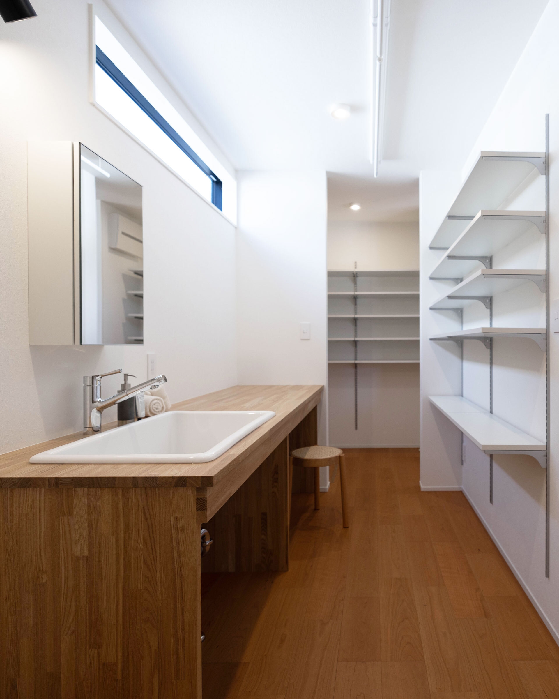 いちいホームの住まいづくりで特に評価が高いのが、「家事動線」に対する設計力です。今回の見学会でご覧いただける家には、共働き家庭や育児世帯の“あったらいいな”を叶える工夫が盛り込まれています。例えば、玄関からすぐにつながるパントリーは、買い物帰りの重たい荷物をすぐに収納できる動線として便利なだけでなく、動線上の無駄を大幅にカットしているのがポイントです。