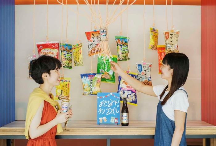 TAMARIBAに、沖縄ならではのチップスをくじ引きで選ぶ「おきなわんチップスくじ」が登場します。ビールのおつまみに相性ピッタリなチップスは、シークワーサー味のポテトチップスやアーサ塩がかかった島どうふチップスなど、沖縄を感じる味わいです。お祭りの千本くじの仕組みで、手前にあるロープを引き、おつまみとなるチップスを選びます。何が当たるか分からないワクワク感を楽しめます!