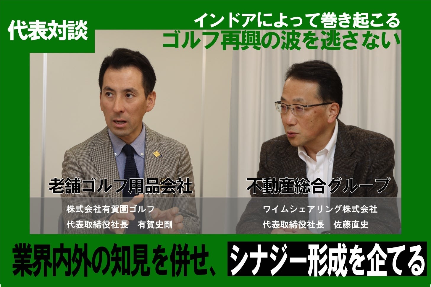 ワイムシェアリング株式会社(東京都新宿区、代表取締役 佐藤 直史)は、運営する郊外を拠点とする完全個室型24時間運営のインドアゴルフ施設【GOLF NEXT 24】を2024年4月22日、ゴルフ用品を製造販売しております有賀園ゴルフ西東京店へのテナント出店を行います。出店を前に弊社代表と株式会社有賀園ゴルフ(群馬県高崎市、代表 有賀 史剛)有賀社長と今後の業界活性化を目的にゴルフ業界誌GEW(以下、本誌)にて代表対談を行いました。