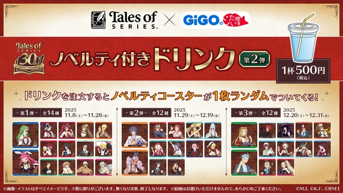 株式会社GENDA GiGOEntertainment(本社:東京都港区 代表取締役社長:二宮 一浩、以下「当社」)は、当社の対象店舗において、今年でシリーズ30周年を迎えるゲーム『テイルズ オブ』シリーズとコラボレーションしたキャンペーン第2弾を開催いたします。
