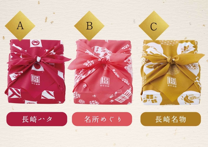 「長崎ハタ」「名所めぐり」「長崎名物」の風呂敷で長崎をより感じられる贈り物になります。