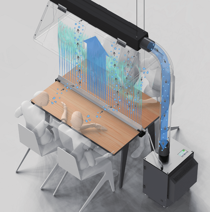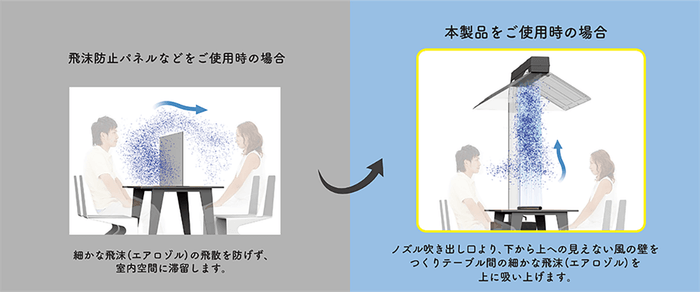 「HARNA」は、風の力を利用してエアロゾル飛沫を吸い込むことで、プラスチック製のパーテーションよりも高い感染防止効果を生み出します。