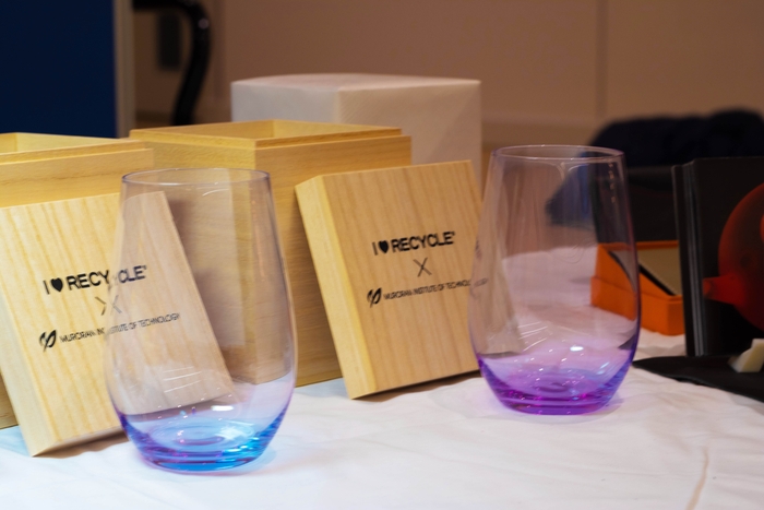 光によって紫や水色に変わるのが特徴であり、ハイブリッド車(HV)のバッテリーに使用されているネオジムをリサイクルしたもので、ガラス工芸品の商品化は世界に類を見ない試みとなっております。