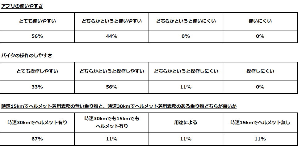 安全講習会の参加者にアンケートを実施しました。当社のアプリや電動バイクについて一定の評価をいただくとともに、速度および安全性への観点からヘルメット着用の必要性を感じているユーザーが多いことも確認できました。