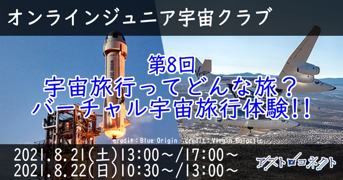 株式会社アストロコネクト(本社:神奈川県川崎市多摩区 代表取締役:荒井大作、以下アストロコネクト)は小学生を対象にした「オンライン ジュニア宇宙クラブ第8回」を8月21日(土)/22日(日)にオンラインで開催いたします。今回のテーマは「宇宙旅行ってどんな旅?」最新の宇宙旅行とは?どんな景色が見られるのか?バーチャルツアーで疑似体験します。