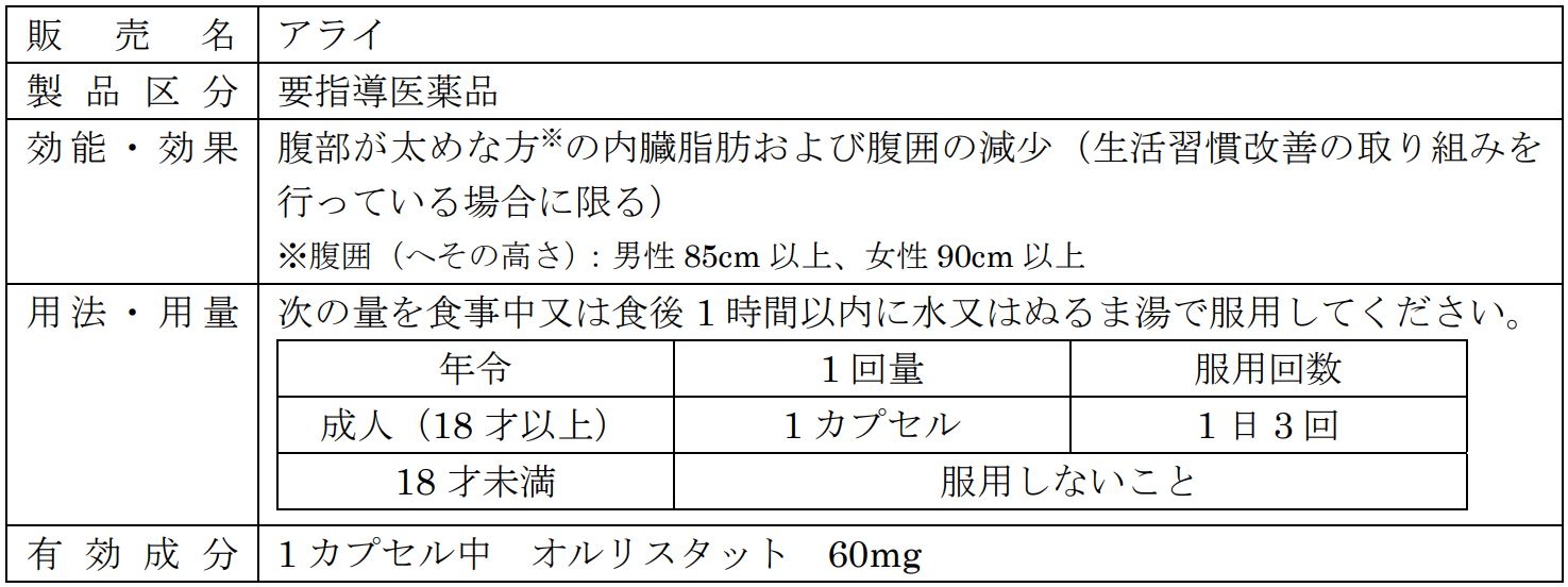 今回、当社が承認を受けたオルリスタット製剤の内臓脂肪減少薬「アライ」は、日本で医療用医薬品での発売を経ずにOTC医薬品として承認されるダイレクトOTCであり、要指導医薬品としての発売になります。