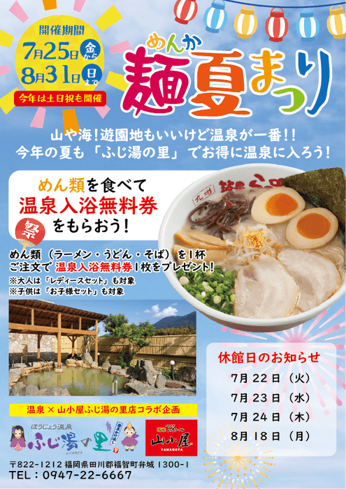 【夏休み応援企画】「九州筑豊ラーメン山小屋」×「ほうじょう温泉 ふじ湯の里」で、7月25日(金)より『麺夏(めんか)まつり2025』開催!麺類を食べると温泉入浴料が無料、夏休みの思い出づくりを応援!