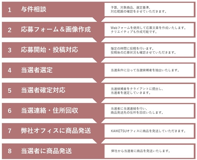 SNSの施策で必要不可欠となったプレゼントキャンペーン施策ですが、個人情報の管理や当選者の抽出を自社で行うことは難しく、コストも発生します。KAIKETSUではPマークを取得しているため機密情報も取り扱うことが可能で、SONARを使いながら準備段階から当選商品の発送まで全て対応いたします。大手企業をはじめとした多数の実績があり、安定したサービスを提供いたします。