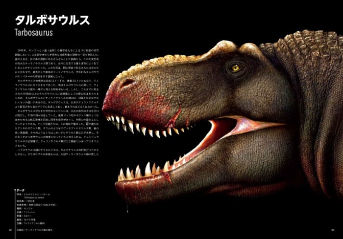白亜紀の恐竜世界を闊歩したタルボサウルスやティラノサウルス・レックスはもちろん、三畳紀からエオラプトル、コエロフィシス、ジュラ紀からブラキオサウルス、カンプとサウルス、白亜紀の植物食恐竜のイグアノドン、パキケファロサウルス、翼竜のカビラムス、プテロダクティルス、さらには、南半球の恐竜を代表するスピノサウルス、カルカロドントサウルスまで70頭以上を掲載。