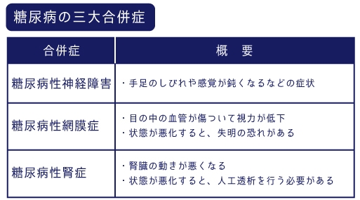 また、血糖値が高い状態が長く続くと血管が傷つき、視力低下などの3大合併症を発症するほか、脳卒中や心筋梗塞など、動脈硬化性疾患を引き起こすリスクが高まります。
