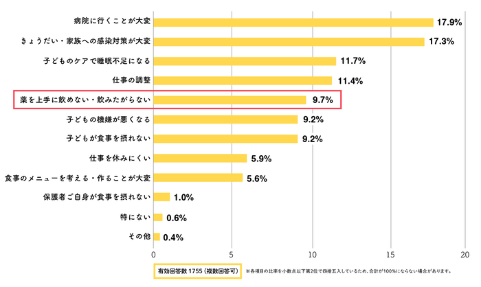 最も多くの方が困っているのは「病院に連れていくこと」でした。家事や仕事と並行して病院に連れていくことは多くの保護者にとって負担となっているようです。また、5位には「薬を上手に飲めない・飲みたがらない」がランクイン。体調を回復させるために薬の服用が必要であっても、子どもに理解してもらうのは難しいのが実情です。