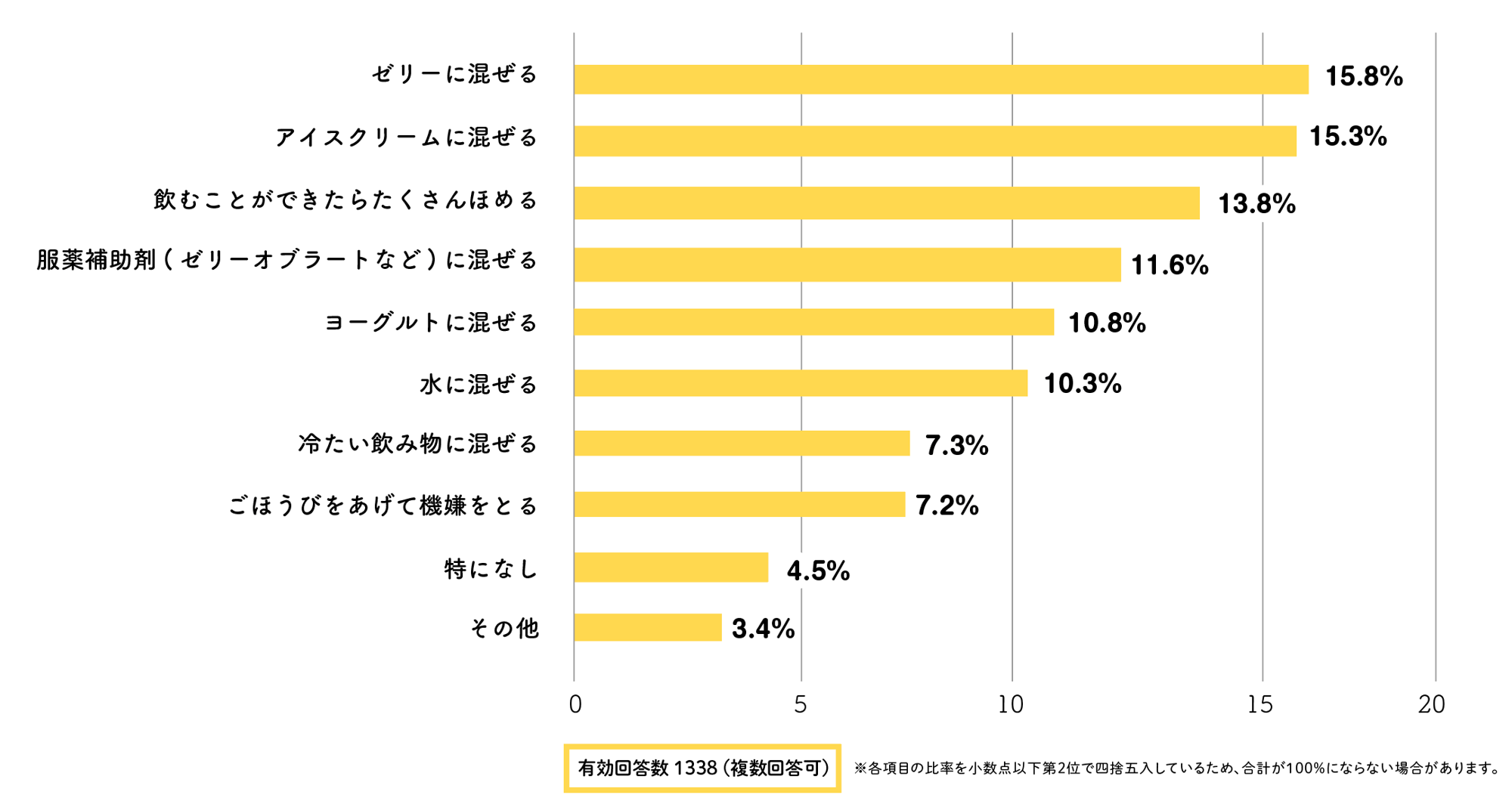 薬を飲ませるための工夫として多かったのは、「ゼリーに混ぜる」「アイスクリームに混ぜる」など、子どもの好きな甘い食品に混ぜる方法でした。次いで、「飲めたらたくさんほめる」「薬を飲んだらご褒美にアイスを食べる」といった、子どものやる気を刺激する方法も見られました。