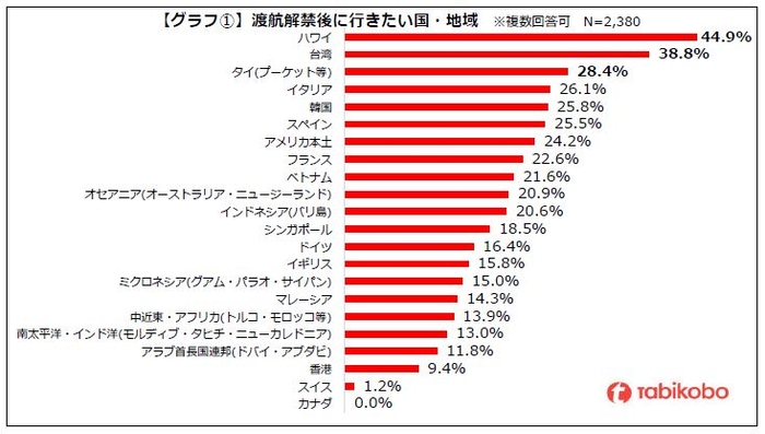 渡航解禁後に行きたい国・地域についての質問では、「ハワイ」が最も多く44.9%、次いで「台湾」が38.8%、「タイ(プーケット等)」が28.4%となりました。※グラフ①参照
