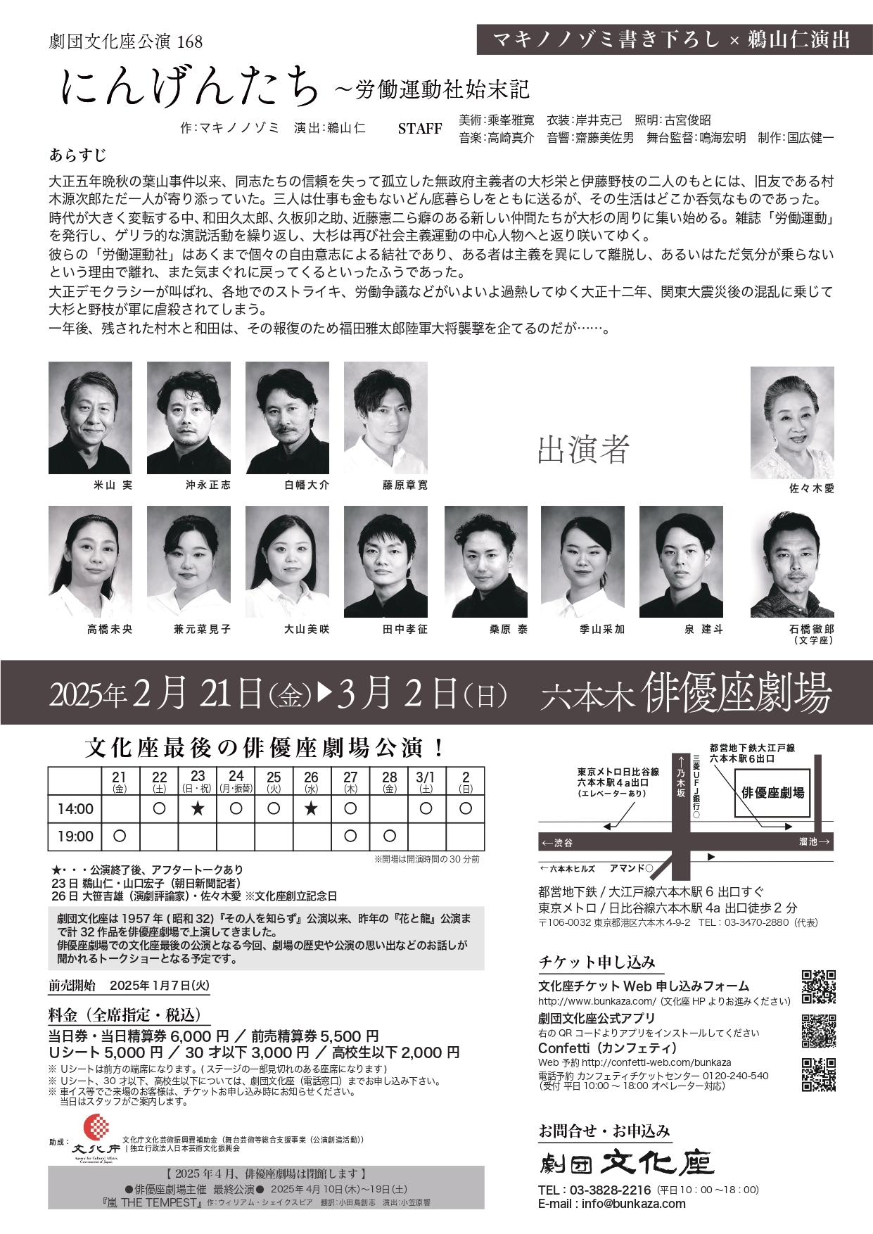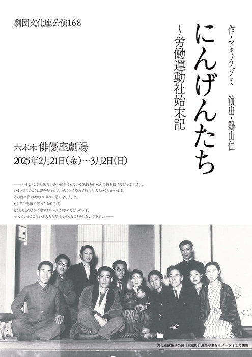 劇団文化座公演168『にんげんたち~労働運動社始末記』が2025年2月21日 (金) 〜 2025年3月2日 (日)に俳優座劇場(東京都 港区 六本木 4-9-2)にて上演されます。