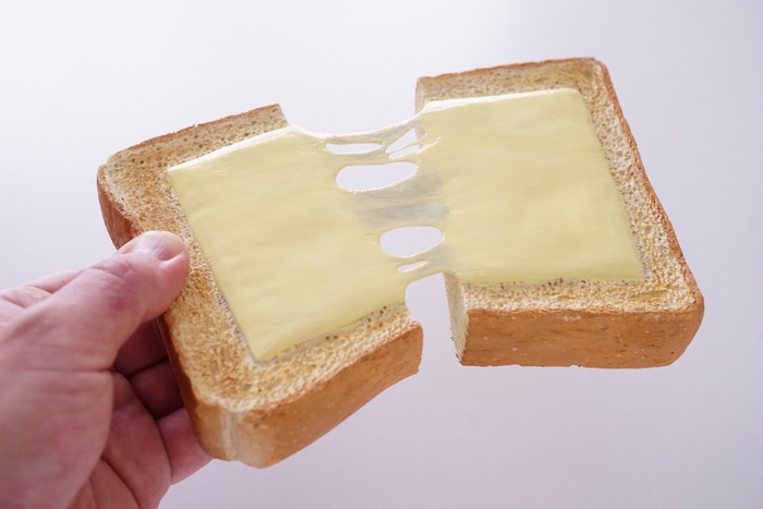 のびているチーズは2cmの厚さがあり、薄く透けている様子は着色で表現されています。