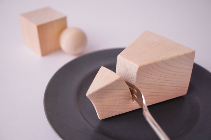 三角の積み木にフォークを入れると、まるでケーキのようにスーっと…。