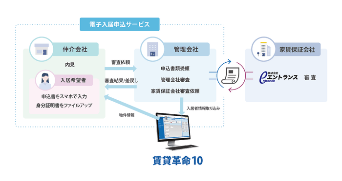 電子入居申込は、弊社が運用する業者間物件流通サービスと合わせてご利用いただく管理会社向けのサービスです。電子入居申込サービスを導入することで、入居申込のやり取りのほとんどをオンラインで完結させることができます。仲介会社とのやり取り等の業務負担を改善することができ、テレワークにも最適です。また、弊社が提供しているクラウド型の賃貸物件総合管理システム「賃貸革命10」と一緒にご利用いただくと、物件情報や入居者情報が連動しますので、不動産業務を更に便利に一貫して行うことができます。