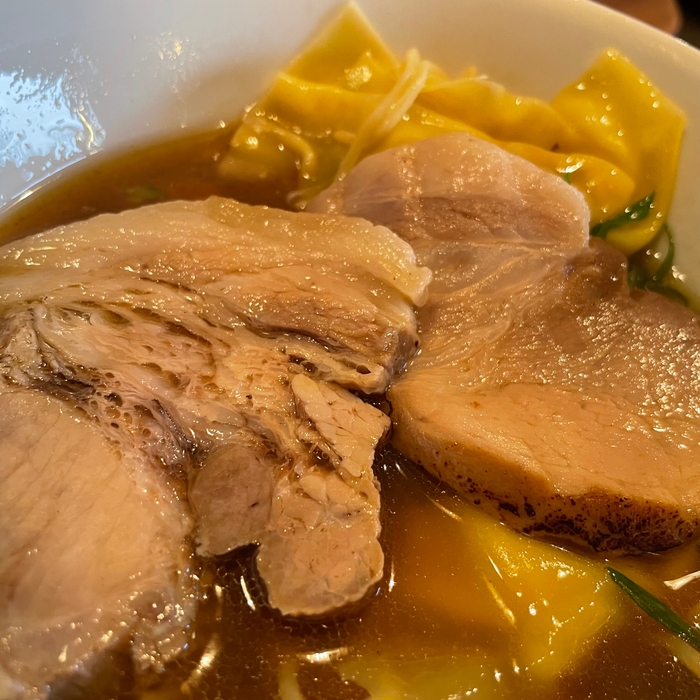 サバ節だけでなく、サバ煮干も使用している為、風味と旨味が非常に強いスープになっております。低温調理豚と煮豚のWチャーシューやルーロー飯、海老と豚のワンタンなど中華の技術を応用したトッピングもベストマッチです。