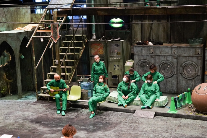そんな作品を紡ぎ上げる稽古場を訪問した。スタジオには『虹む街』で用意された横浜・野毛をモデルにした飲食店街のセットが組まれている。ただし今回はそこから10年、20年、もしかすると100年先の「街」だ。コインランドリーやスナックはホコリにまみれ、存在がニジんでいるように見える。そのせいで「街」は既に機能を失っているかのように見えるが、もし人々が集まることを「街」の機能とするなら、『虹む街』は辛うじて生きているのだといえるだろう。そこには同じ緑のつなぎを着た人々が、まるで肩を寄せ合うようにして暮らしているのだから。