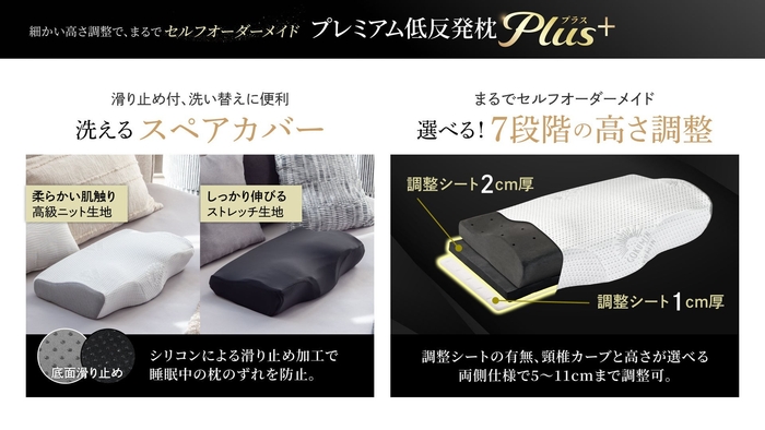 2019年の発売以来、多くの支持を集めたベストセラー枕が、さらなる進化を遂げました。高さ調整は従来の4段階から7段階へとアップグレードし、5~11cmの範囲で自分に最適な高さを選べます。さらに、付属カバーが2枚セットになり、柔らかなニット生地と伸縮性のあるストレッチ生地の2種類を用意。洗い替えがしやすく、常に清潔に保てます。滑り止め加工により枕のズレを防ぎ、寝返り時の快適さも向上し、安定した眠りをサポートします。