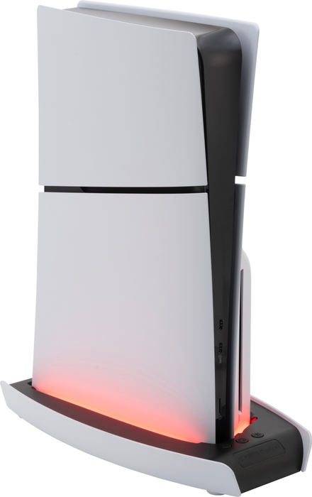 本製品は、11月に発売された新型PS5(PS5 slim)を縦置きにできるスタンドです。安定性が高いため、縦置きにしても本体が転倒しにくく、テレビの横などの狭いスペースにも設置が可能。PS5 slim本体と統一感のあるデザインを採用しており、本体を上から差し込むだけで簡単に設置できます。また、さまざまな色に光るRGB LED機能を搭載しています。