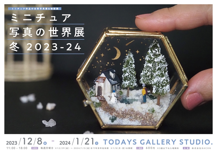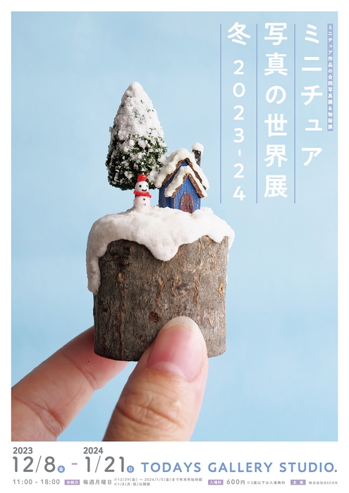 株式会社BACON(べーこん)は、これまでに30万人以上を動員した本物かと見間違うほど精巧に作られたミニチュアアート作品の合同写真展&物販展「ミニチュア写真の世界展 冬 2023-24」をギャラリー「TODAYS GALLERY STUDIO.」(東京都浅草橋)において2023年12月8日(金)~2024年1月21日(日)に開催いたします。冬開催は初めてとなり、冬の彩りを感じるドールハウスや雪化粧されたミニチュア作品など冬に特化した新たなミニチュアの世界をお楽しみいただけます。