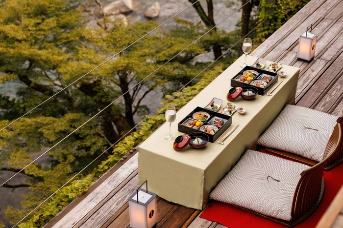 空中茶室は、星のや京都の目の前を流れる大堰川にせり出すように作られたウッドデッキスペースで、嵐峡の新緑の景色を愛でるための特等席です。川からの風に乗った爽やかな新緑の薫りも肌で感じられます。ダイナミックな景色と新緑の薫りを楽しみながら、夕刻から夜までの時間をゆったりと過ごすことができます。